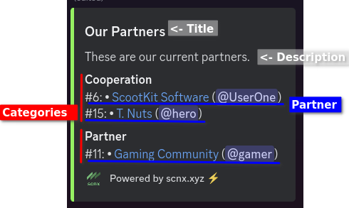 Categories | These are the categories that partners can be assigned to. Each category needs to be unique. Only these categories can be selected via commands. |