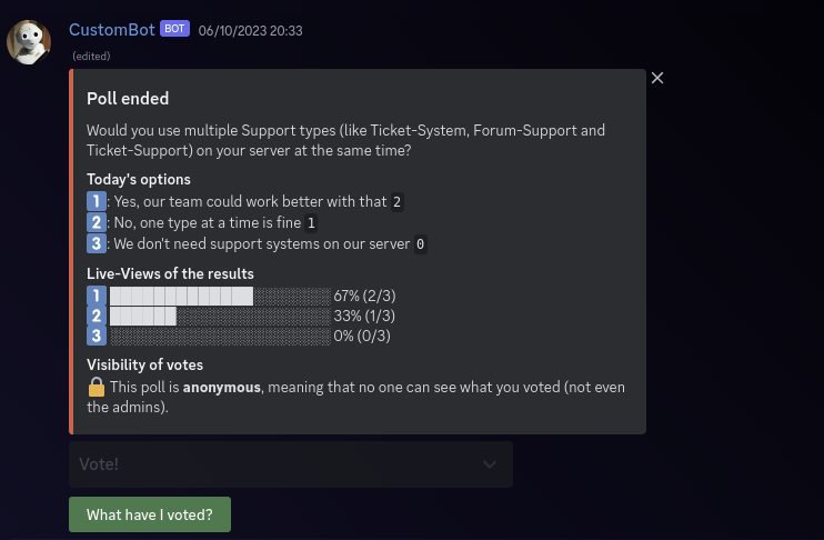 Emojis | In this fields, you can customize the emojis that will be displayed next to each voting option in the dropdown menu and in the embed. Make sure you enter Unicode values for built-in-emojis or valid Emoji-IDs (not just the name) for custom emojis. |